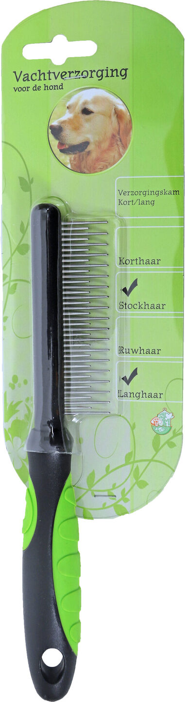 Deze verzorgingskam verzorgt de vacht van uw hond door deze los te maken, op deze manier worden losse haren, vuil en eventuele klitten verwijderd. Deze verzorgingskam is geschikt voor alle honden met een onder en boven vacht. Het regelmatig kammen en borstelen van uw hond draagt er aan bij dat de vacht in topconditie blijft. Zo blijft de vacht glanzend schoon en ontstaan er minder snel klitten. Verzorg de vacht altijd in de richting van de haargroei, zodat de verzorging voor zowel u als uw hond vlekkeloos verloopt.