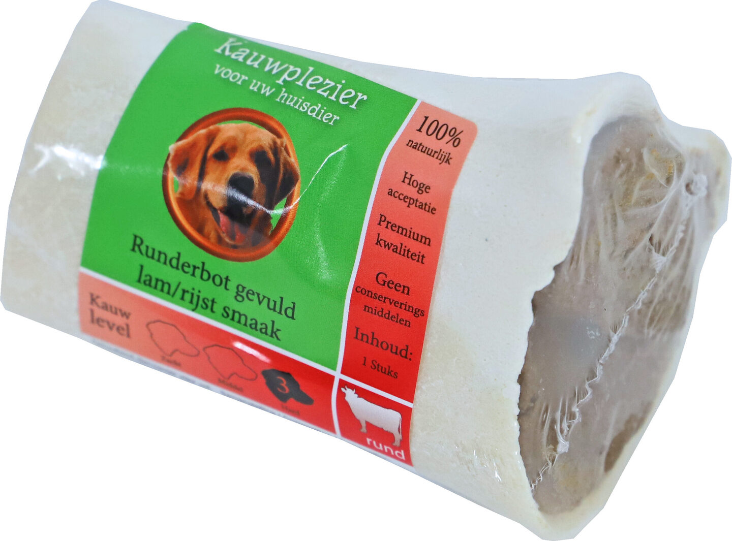 Deze rundermergpijp is een fijne snack voor honden. Eerst kunnen ze die heerlijke lam en rijst vulling uit de mergpijp likken en vervolgens hebben ze nog een hard bot om op te kauwen.