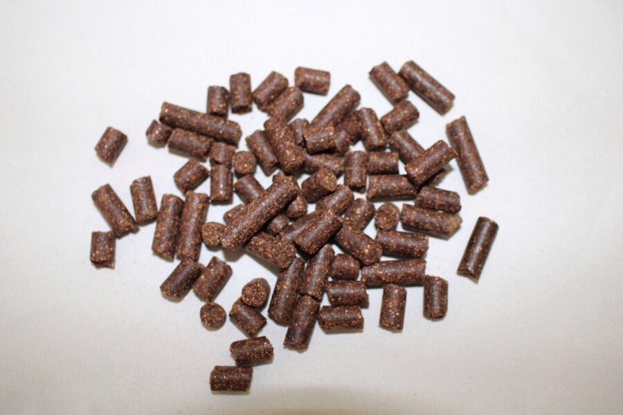 Mais, vleesmeel, gevogeltevet, hemoglobine, weipoeder, lignocellulose, zalmolie, lijnzaad, inuline, vitamine, mineralen