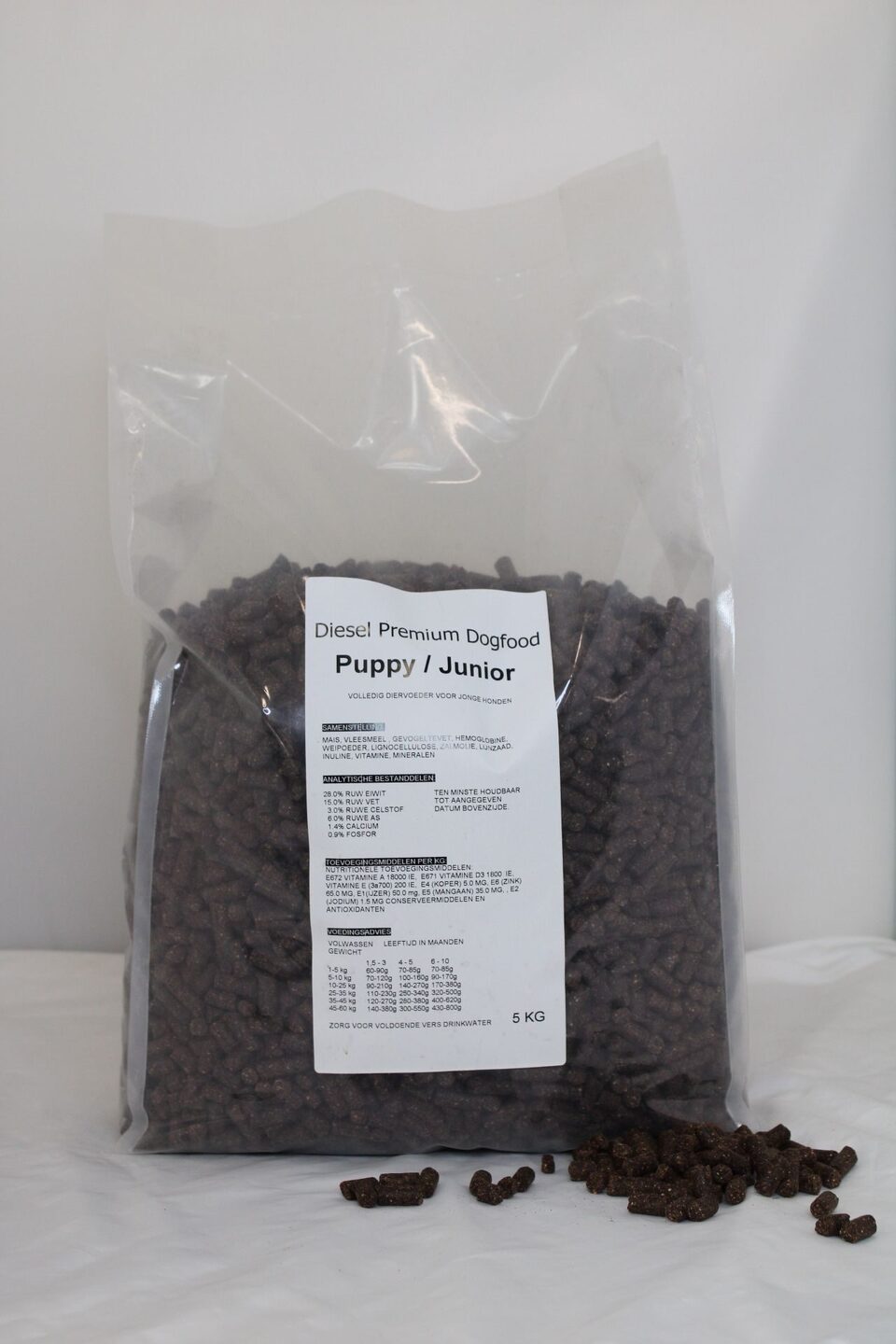 De Diesel Puppy/Junior hondenbrok is een hoogwaardige koud geperste brok voor pups en opgroeiende honden. Afhankelijk van het ras en groeisnelheid word deze brok gemiddeld 9 maanden gevoerd. Daarna kan overgestapt worden op de Diesel Adult of Special Care. Door het persen op lage temperatuur blijven de natuurlijke vitamines en mineralen in het voer behouden. Deze brok bevat een hoog vlees aandeel (24% kip/rund) en is geproduceerd zonder tarwe. *Het is dus een tarwe/glutenvrije voeding. Geperste brokken belasten het maag/darm kanaal minder dan geëxtrudeerde brokken. Dit komt door een zwaarder soortelijk gewicht. Ontlasting is daarom beter geconcentreerd en minder in hoeveelheid.