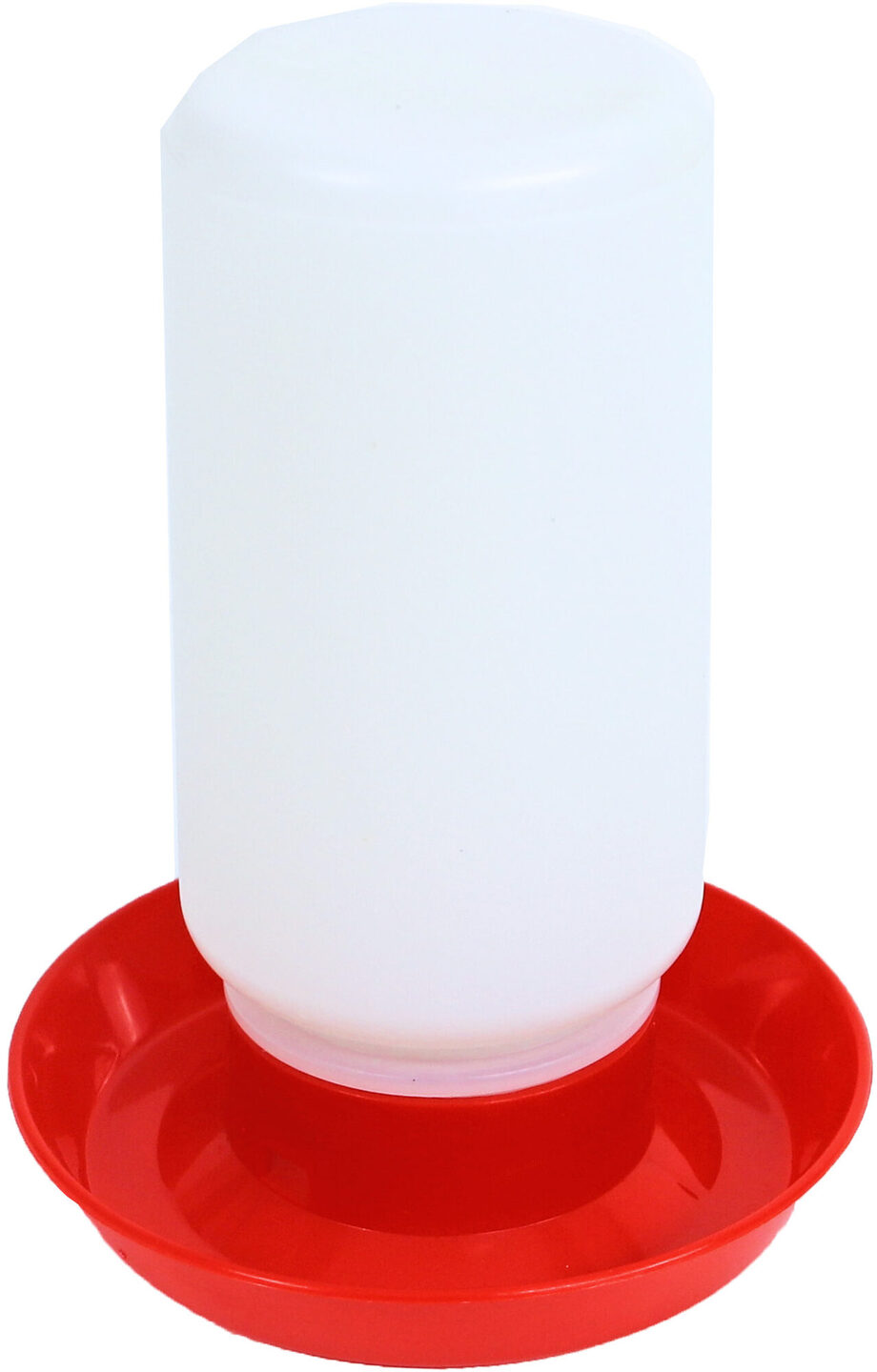 Drinkfontein kuiken plastic, 1 liter. Vul de fontein met drinkwater en draai daarna de bodem op de toren. De drinkfontein heeft een gat waaruit het water komt en zich verspreidt over de gehele bodem. Hierdoor komt er weinig vuil in het drinkwater terecht. Deze rood witte plastic drinktoren is te gebruiken in een volière, kippenren, of gewoon op een open plaats.