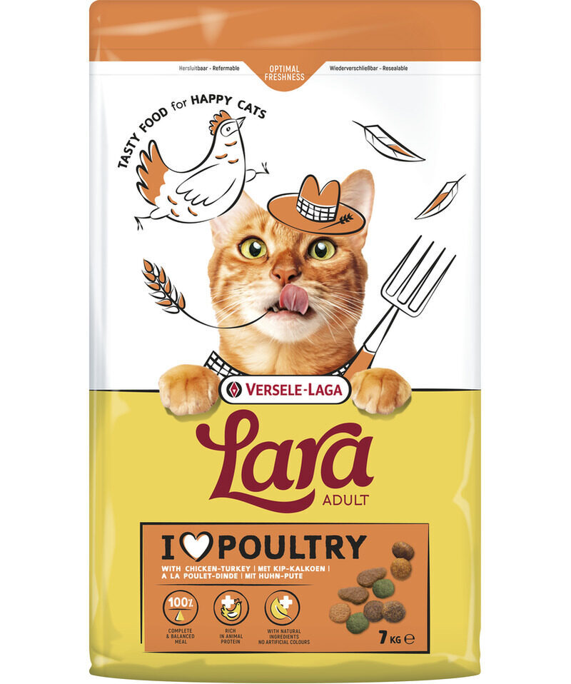 De brokjes met kip en kalkoen bevatten alle nodige mineralen en vitaminen die jouw actieve kat kan gebruiken. Lara Adult met Kalkoen & Kip is een volledig diervoeder voor volwassen katten vanaf 1 jaar.