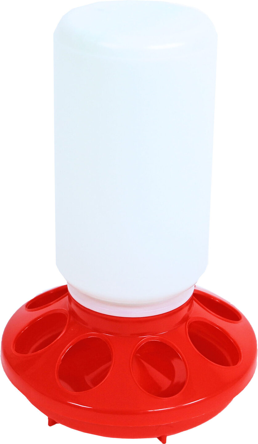 Deze voerfontein van plastic is erg handig om te gebruiken als voertoren voor meerdere kuikens. De voerbak is rondom opgesplitst in meerdere compartimenten. Hierdoor heeft elk kuikentje zijn eigen eethoekje.