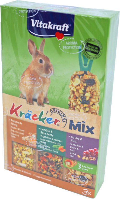 Doordat de Kräcker meerdere keren is afgebakken, zitten de ingrediënten stevig op het houten stokje en moet het konijn moeite doen om de granen los te krijgen. Dit geeft het dier de nodige beweging en zorgt ervoor dat hij zijn snijtanden op natuurlijke wijze kan slijten. De Kräcker bevat belangrijke mineralen en is hierdoor een prima aanvulling op het dagelijkse rantsoen.
